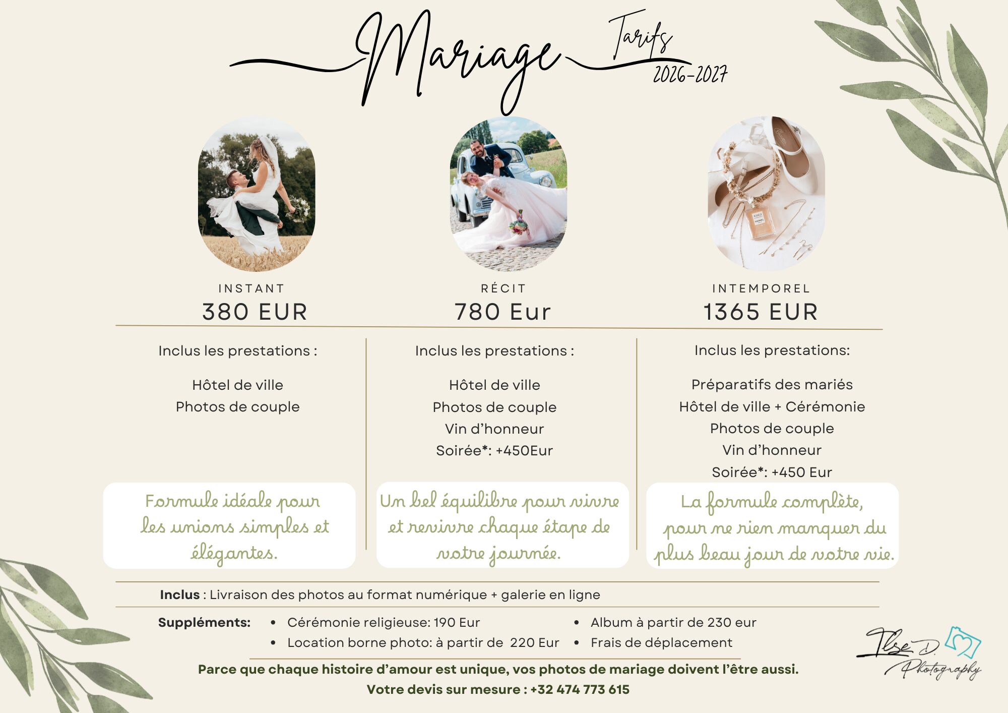 Contactez-moi et réalisons votre devis adapté à votre journée +32 474 773 615