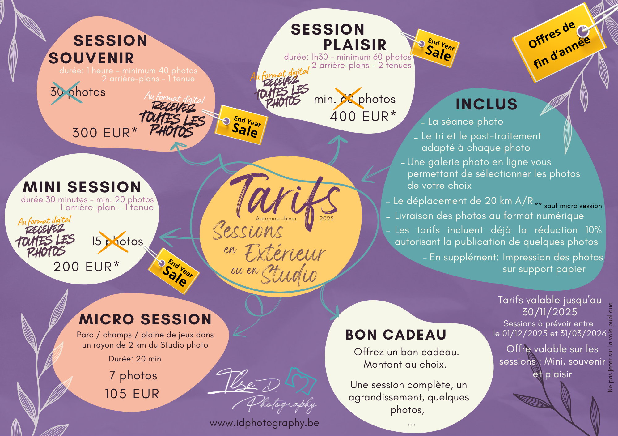 * Supplément de déplacement à prévoir pour les sessions extérieures à plus de 20 km aller-retour du studio.